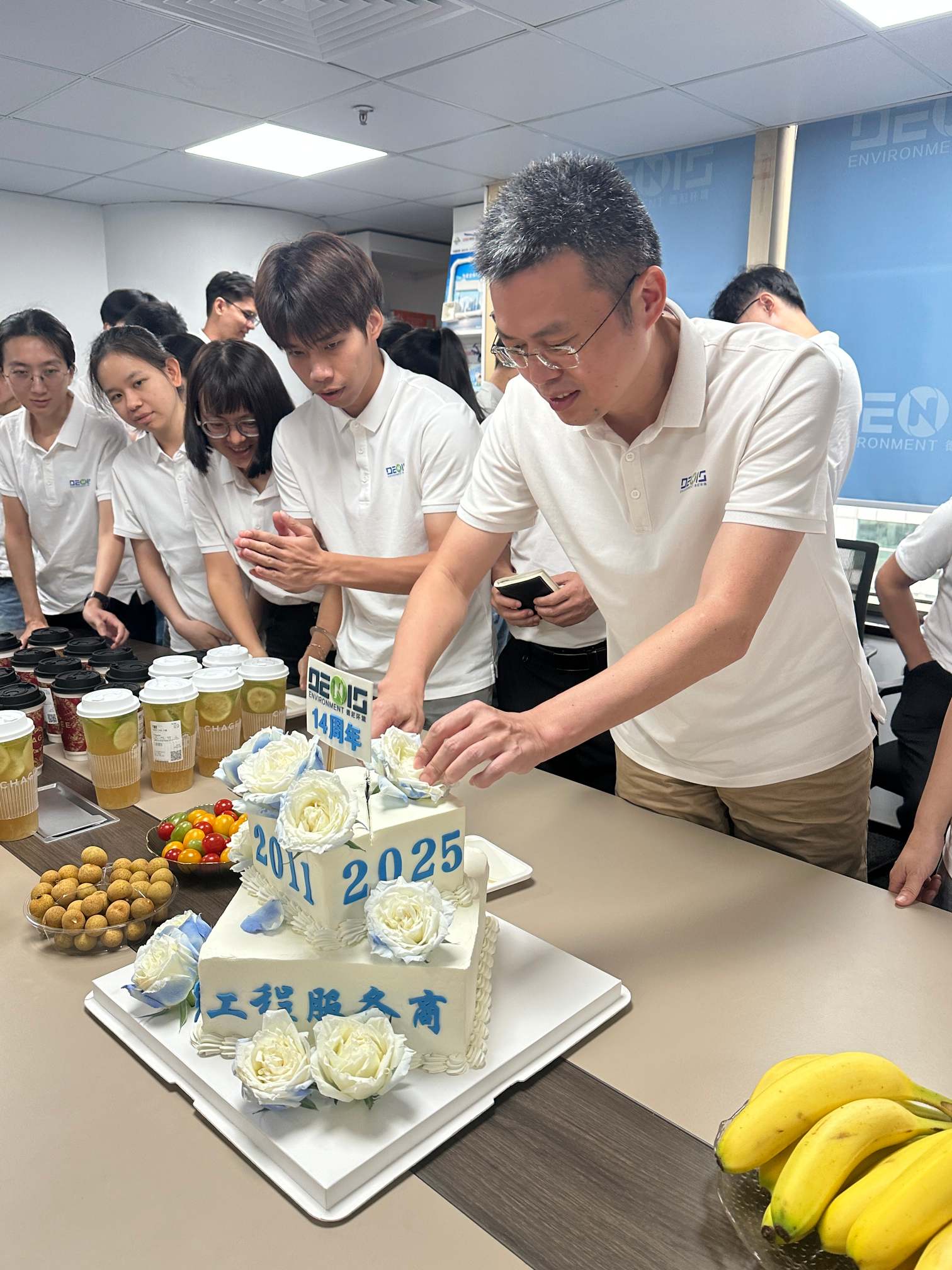 总经理手持刀具,在大家的欢呼声中切下了第一块蛋糕。蛋糕上装饰着“德尼14周年”的字样,象征公司走过的辉煌岁月。总经理将蛋糕分发给员工,每一块都承载着对未来的美好祝愿。